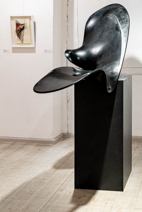 Axel Anklam has executed his filigree, organic-looking sculptures with craftsmanship perfection. Like a draftsman, he used the pictorial elements of line and surface and transferred them into three-dimensional space. He covered the supporting framework, the curved, bent and tilted outlines made of metal, with wafer-thin surfaces made of epoxy resin or carbon, which overlap depending on the viewer’s position. These flawlessly shiny skins reflect their surroundings or are translucent materials through which light flows. Anklam had a musical understanding of sculptural forms. He derived the lengths of his sculptures from the sounds of the strings of a musical instrument. From these sound experiments with a monochord, he developed his graceful sculptures, which he combined with impressions and memories of landscape formations or human encounters.